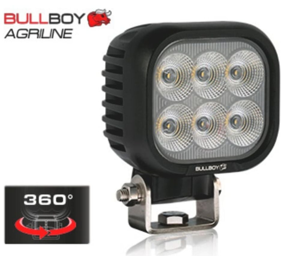 BULLBOY Agriline on tehokas LED -työvalo, jotka on asennettu 360 astetta kääntyvään jalustaan.